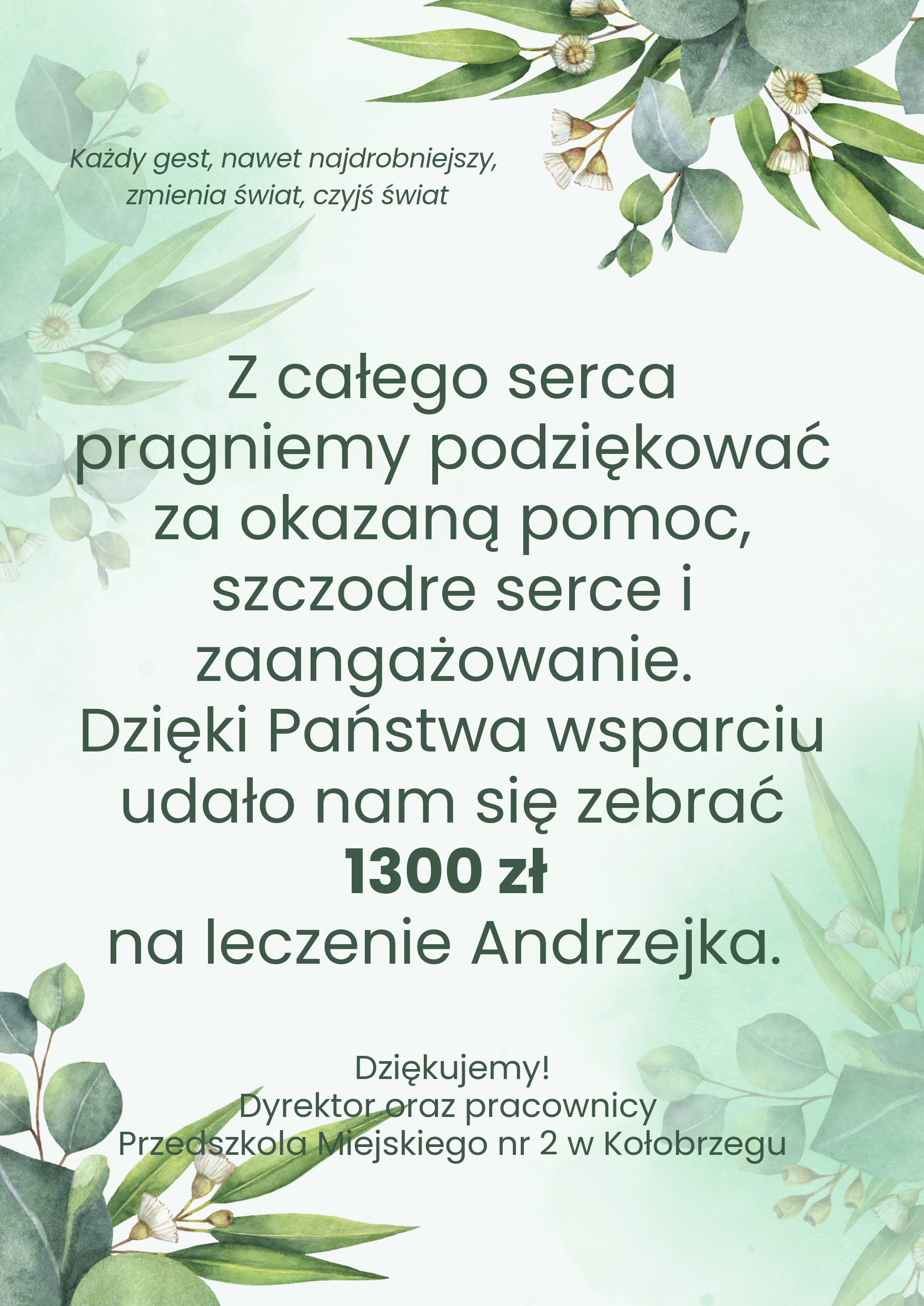 Dzięki Państwa wsparciu udało nam się zebrać 1300 zł na leczenie Andrzejka.